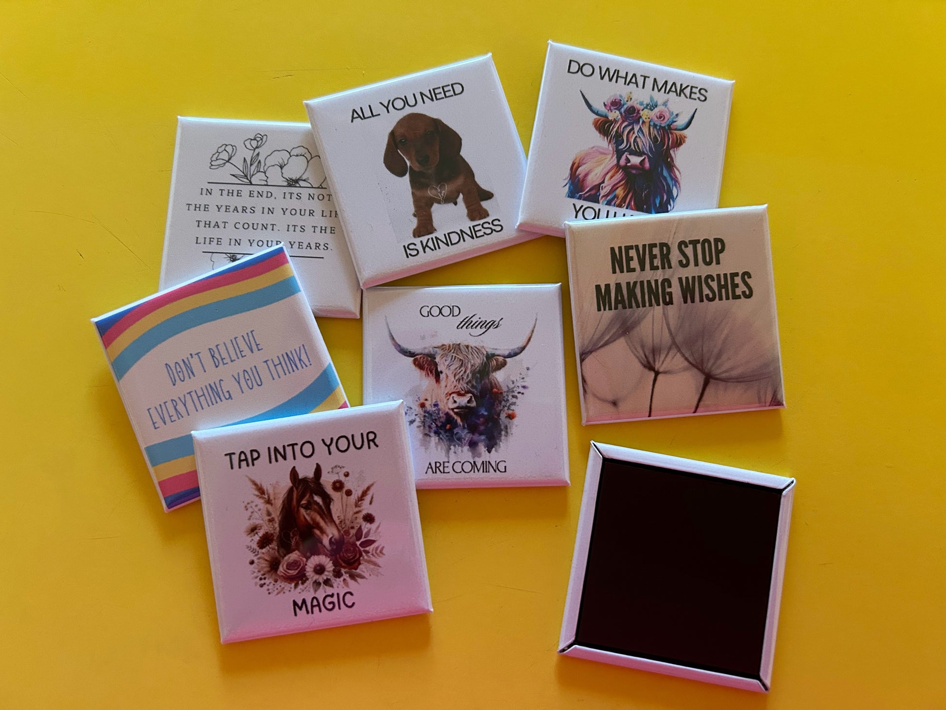 Vibrant and durable prints on square magnets (50mm x 50mm each).